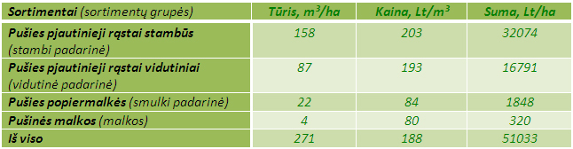Iškirtus brandaus pušyno hektarą arba išmatavus kertamus medžius nustatyta, kad paruošta arba galima paruošti 271 m³ likvidinės medienos. Tai atitinka privačių ir rezervuotų privatizavimui IV grupės miškų vidutinį brandų pušyną (VMA, 2012-01-01). Medienos sortimentai įvertinti 2012 m. pirmo pusmečio (sausio–liepos mėn.) apvalios medienos vidutinėmis kainomis (2 lentelė).